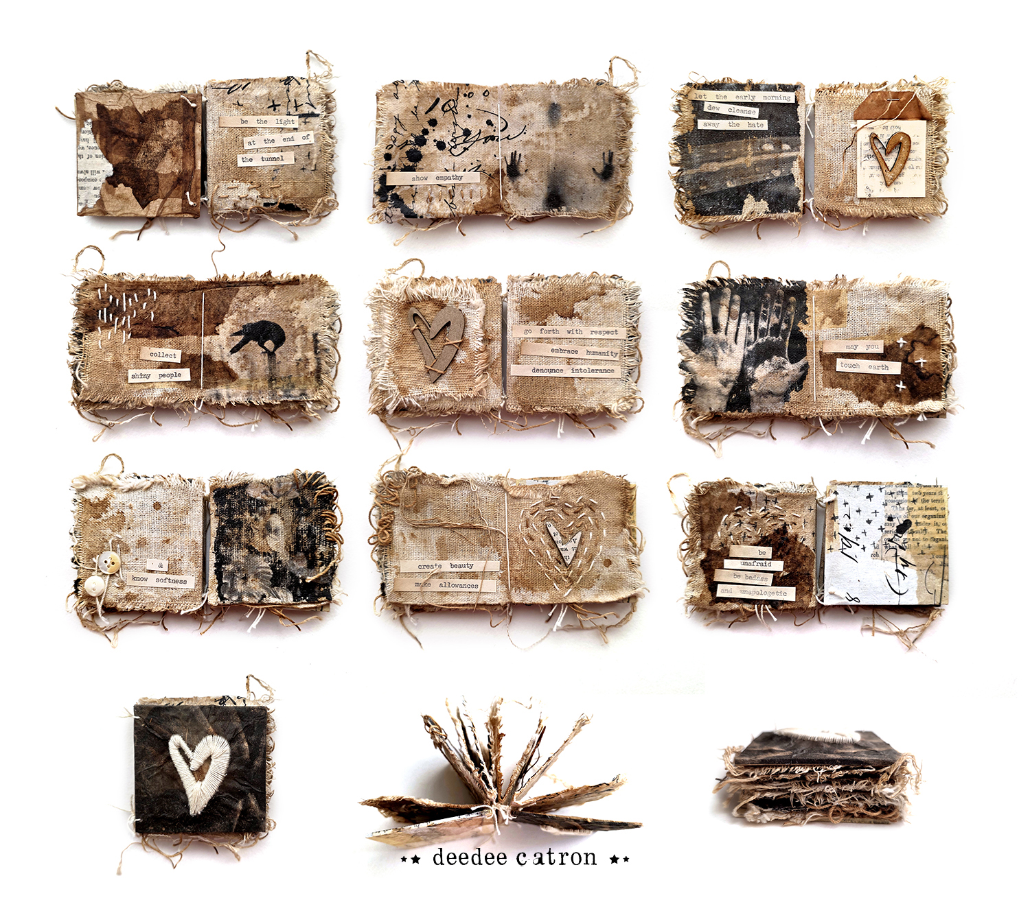 CO-TAUGHT WORKSHOP : Tiffany Sharpe & DeeDee Catron unite to share mini books full of powerful words. Utilizing an UWS curated kit, each artist made a palm sized (2.5 x 2.5 inch) book using various techniques & art mediums. A miniature masterclass in book making!